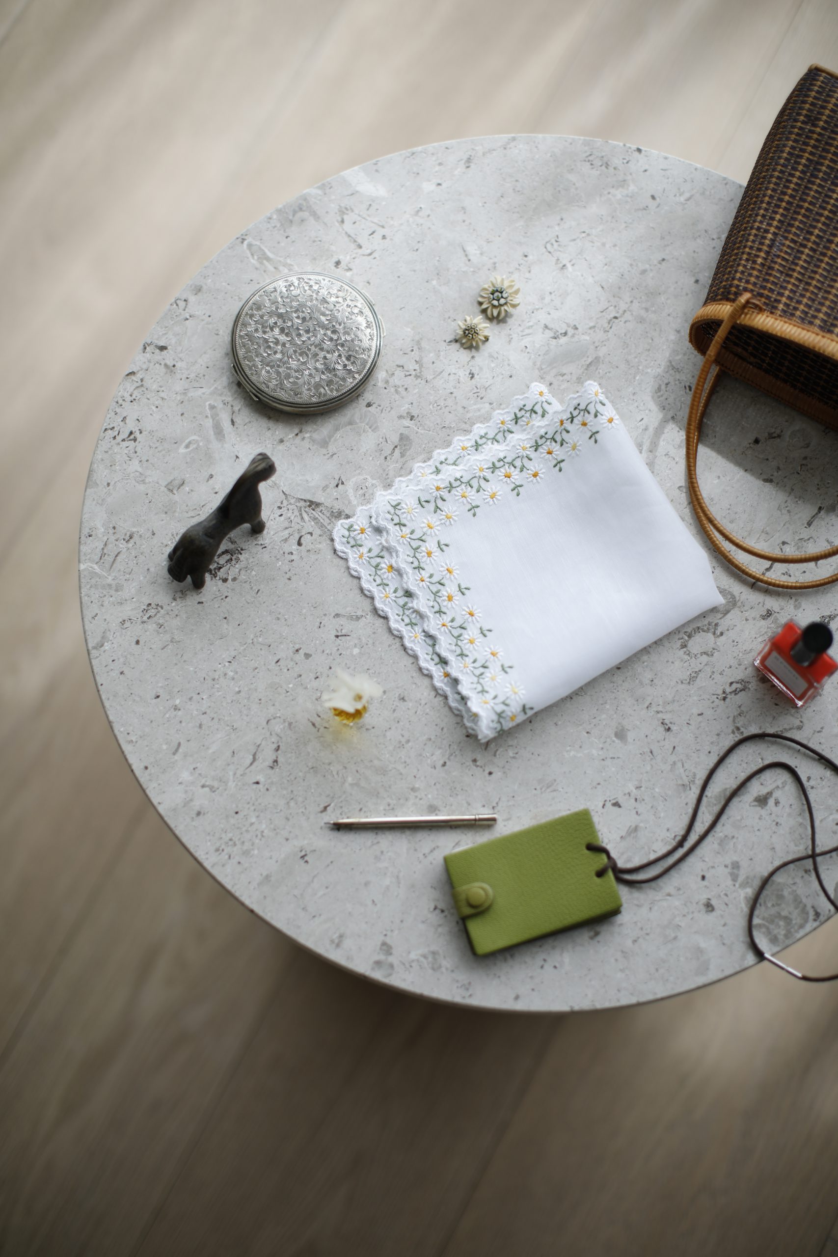 〈散らかりがちな紙ものをまとめる、手提げカゴ。〉